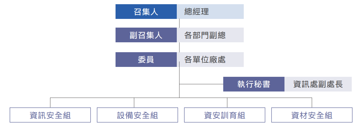 2024年風險管理運作及督導情形本公司訂有「資訊安全委員會設置辦法」,由總經理擔任召集人(兼任資訊安全長),成員包含各單位廠處長,轄下設有資訊安全、設備安全、資安訓練及資材安全組,每季召開會議檢討資訊安全執行情形,並每年1次向董事會報告資訊安全執行成果。