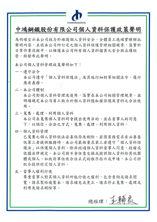 本公司遵循《個人資料保護法》訂定「個人資料保護政策聲明」,使全體員工瞭解且依本公司個資保護管理相關規章,落實日常作業,以維個資之安全與永續經營。
