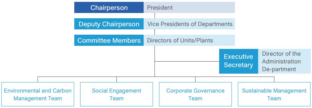 To effectively address ESG issues, review implementation outcomes, and drive continuous improvement, CHS established a company-level Sustainable Development Committee in September 2024. The Committee is chaired by the President and consists of four teams: the Environmental and Carbon Management Team, Social Engagement Team, Corporate Governance Team, and Sustainable Management Team. Each team is led by a department head from the relevant business unit. The Committee convenes regular meetings at least twice a year to discuss matters such as the promotion of sustainable development policies, the setting and tracking of sustainability goals, the preparation of the Sustainability Report, and the review of proposals or reports to be submitted to the Board of Directors. Additionally, the Chairperson reports to the Board twice a year on the execution results, including the progress, achievements, and promotion plans related to sustainability initiatives; the status of ethical corporate management; stakeholder engagement activities; and the basis, process, and content of the Sustainability Report. The following key sustainability-related matters were reported to the Board in 2024: